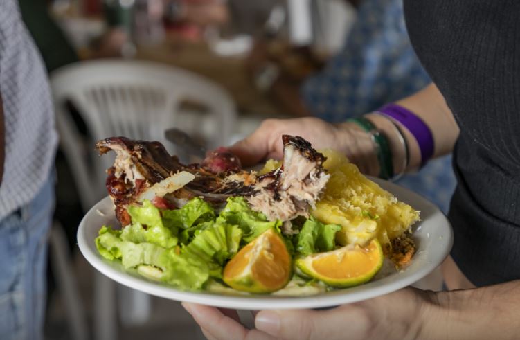 Um delicioso prato completo com carne, salada e uma fatia de limão fazem o sucesso da festa
